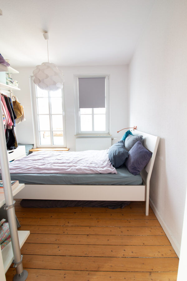 • Es besteht die Möglichkeit, einzelne Einrichtungsgegenstände vom Vormieter zu übernehmen (Plissees/Rollos, offener Kleiderschrank im Schlafzimmer)