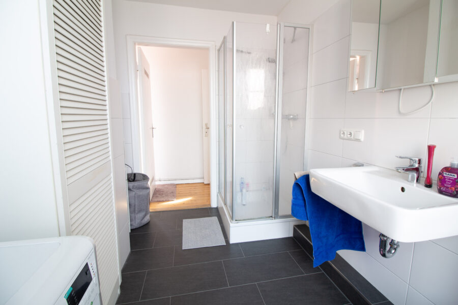Von der Küche aus gelangen Sie in den zweiten Flurbereich, von dem mehrere Räume abgehen: ein Zimmer mit Zugang zur Dachterrasse, das Badezimmer mit Dusche und Fenster sowie ein weiteres Zimmer.