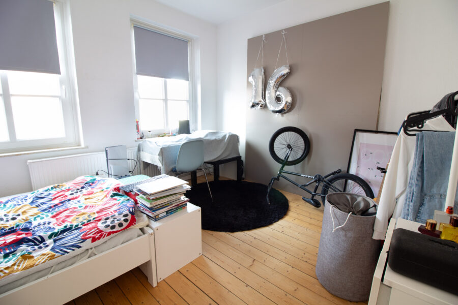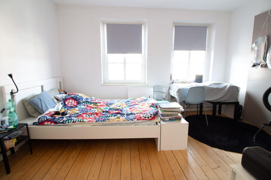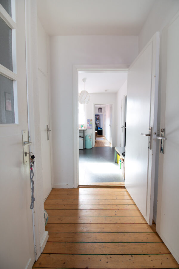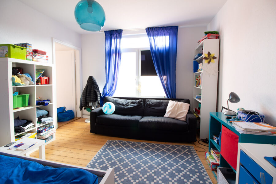 Eine Besonderheit der Wohnung betrifft die Raumaufteilung zwischen Wohnzimmer und dem angrenzenden Zimmer, welches über die Küche erreichbar ist. Ursprünglich sind beide Räume über einen breiten Durchgang miteinander verbunden und bilden damit einen großzügigen Wohn- und Essbereich. Die aktuelle Mieterin hat diesen Durchgang abgetrennt, sodass derzeit ein zusätzlicher Raum entsteht. Auf Wunsch kann diese Lösung übernommen werden, alternativ wird der Durchgang vor Einzug wieder geöffnet.
