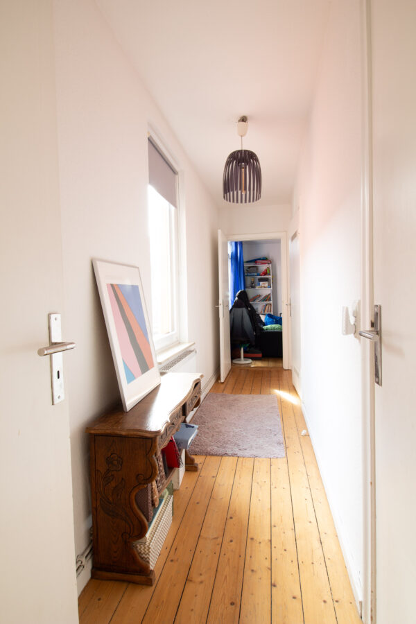 Beim Betreten des Eingangs gelangen Sie zuerst in einen kleinen Flur mit einer praktischen Ecke für einen Garderobenbereich. Von hier aus erreichen Sie das Wohnzimmer sowie einen Abstellraum. Der Flur führt weiter in die Küche mit Einbauküche inklusive Geschirrspüler – ein schöner Mittelpunkt der Wohnung.